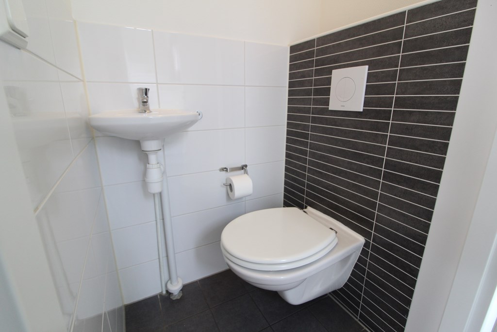 Op de begane grond bevindt zich een slaapkamer met een aangrenzende badkamer, uitgerust met ligbad, wastafelmeubel en toilet. Daarnaast is er een separaat gastentoilet aanwezig.