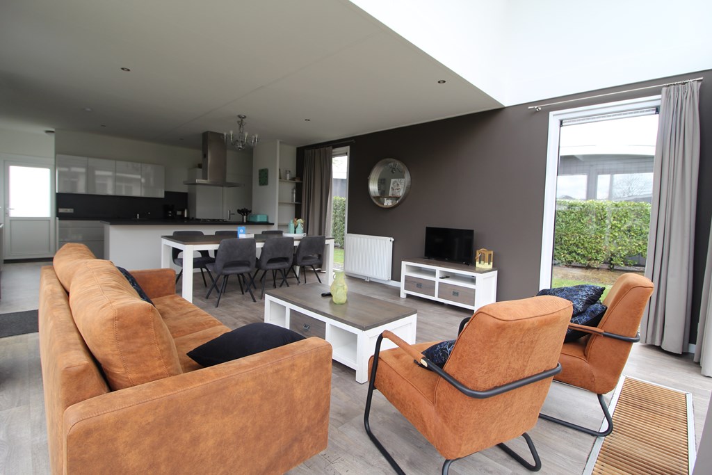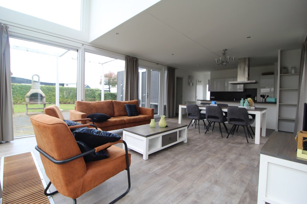 De living vormt het hart van de woning en kenmerkt zich door de grote raampartijen, die zorgen voor een aangename lichtinval en een mooi uitzicht op de tuin en het water. De combinatie van een comfortabele zithoek en een ruime eethoek maakt dit een fijne leefruimte, geschikt voor zowel ontspanning als samenzijn.