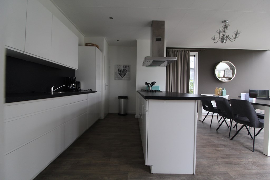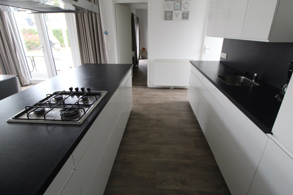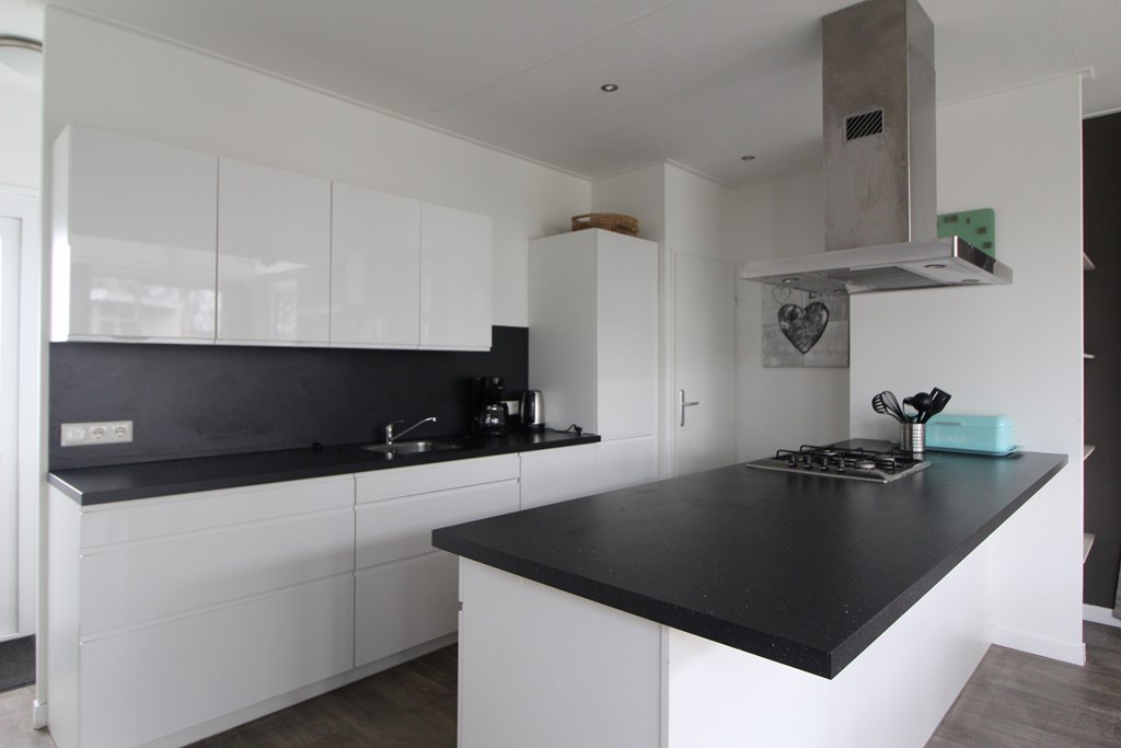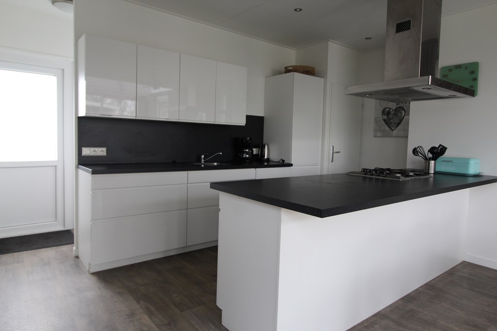 De open keuken is modern uitgevoerd en van alle gemakken voorzien, met onder andere een koelkast, diepvries, vaatwasser, oven en een gaskookplaat met afzuigkap. De afwerking is verzorgd en sluit naadloos aan op de rest van het interieur.