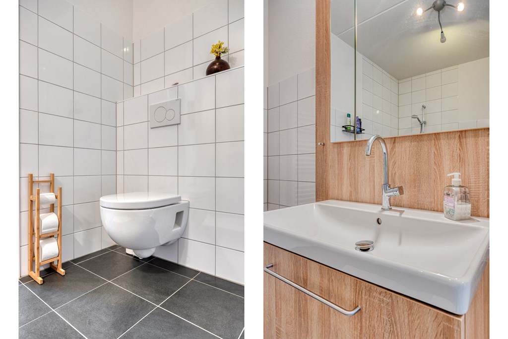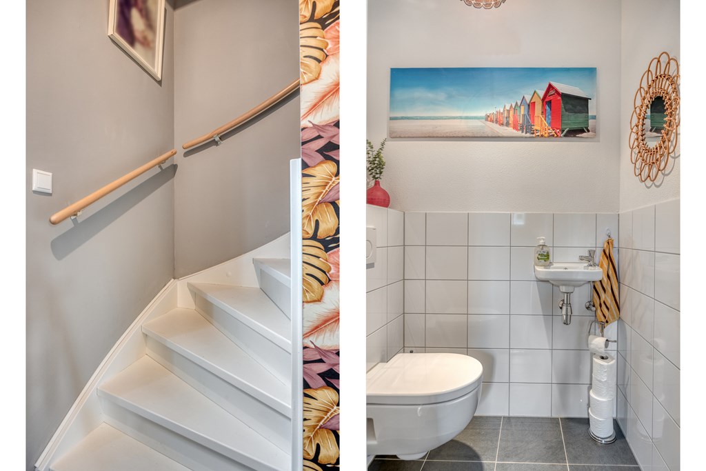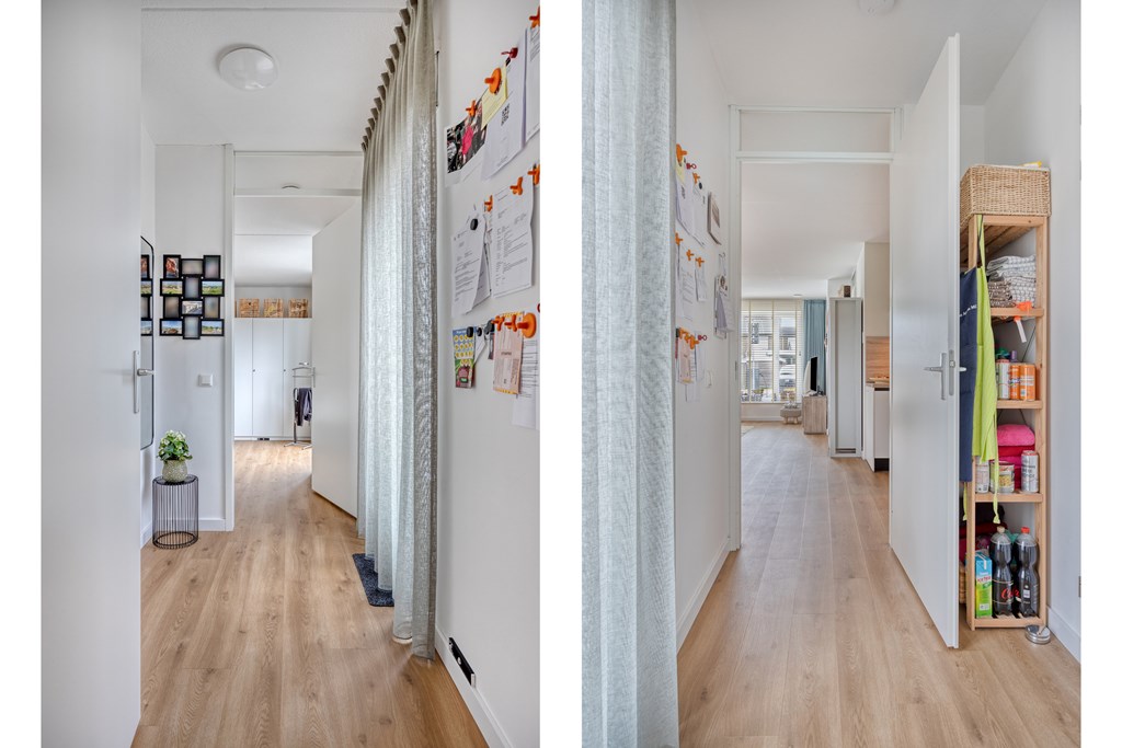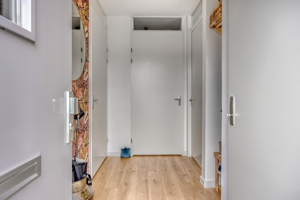 Via de entree komt u in de hal met meterkast, een praktische bergkast en een modern separaat toilet. Vanuit de hal bereikt u de lichte en ruim opgezette woonkamer.