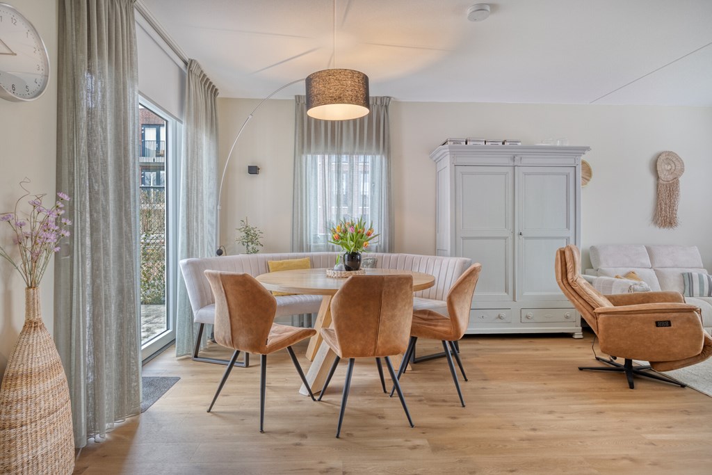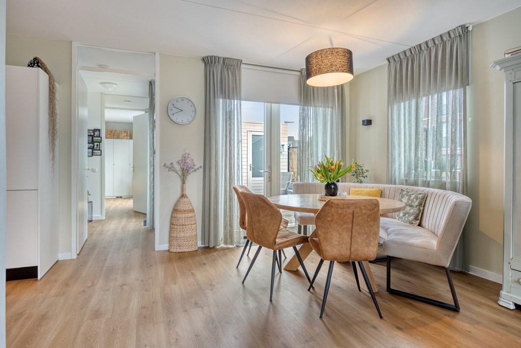 De woonkamer biedt volop ruimte voor een comfortabele zithoek en een ruime eethoek. Grote raampartijen zorgen voor veel natuurlijke lichtinval en een prettige, open sfeer.