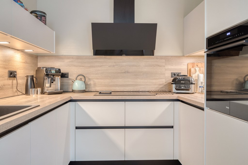 De open keuken staat in directe verbinding met de woonkamer en biedt voldoende ruimte voor een moderne keukenopstelling met de navolgende apparatuur inductiekookplaat, combi-oven, afzuigkap, vaatwasmachine, koelkast en diepvries.