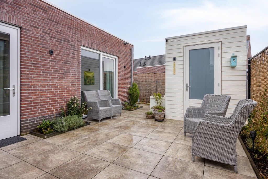 Via een tussenhal bereikt u het slaapgedeelte op de begane grond. Hier bevindt zich een ruime slaapkamer aan de achterzijde van de woning. Aangrenzend ligt de badkamer, voorzien van onder andere een inloopdouche, wastafel en toilet. Hierdoor is volledig gelijkvloers wonen mogelijk.