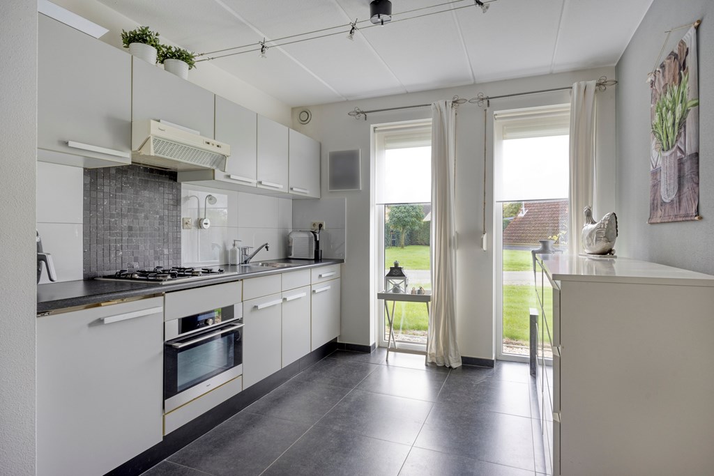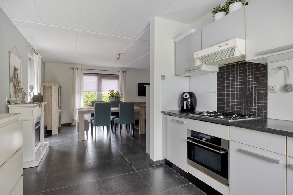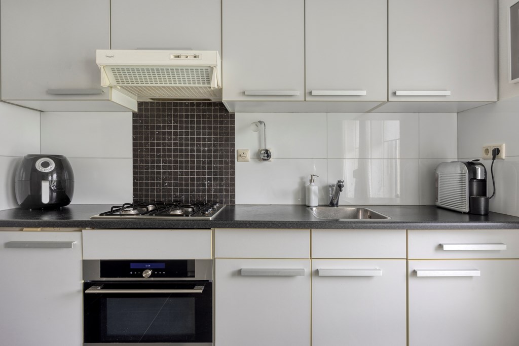 U komt binnen in een lichte woonkamer met een gezellige zit- en eethoek. De open keuken is modern ingericht en voorzien van inbouwapparatuur zoals een gaskookplaat, oven, koelkast en afzuigkap.